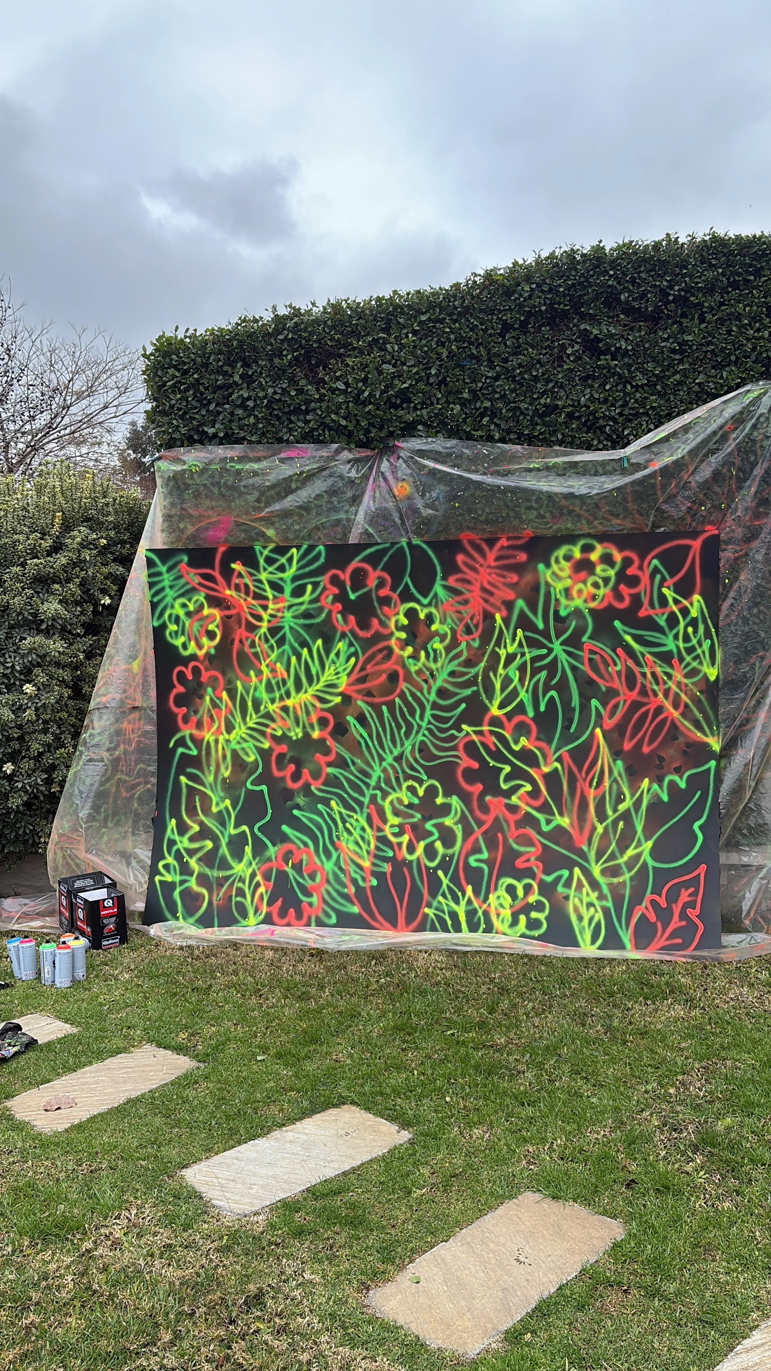 Pista de cachengue: diseñé e intervine murales con aerosol fluorescente sobre placas de madera, inspirados en el logo de la flor —símbolo de la fiesta— y en la naturaleza tropical, generando un escenario visual potente detrás del DJ.