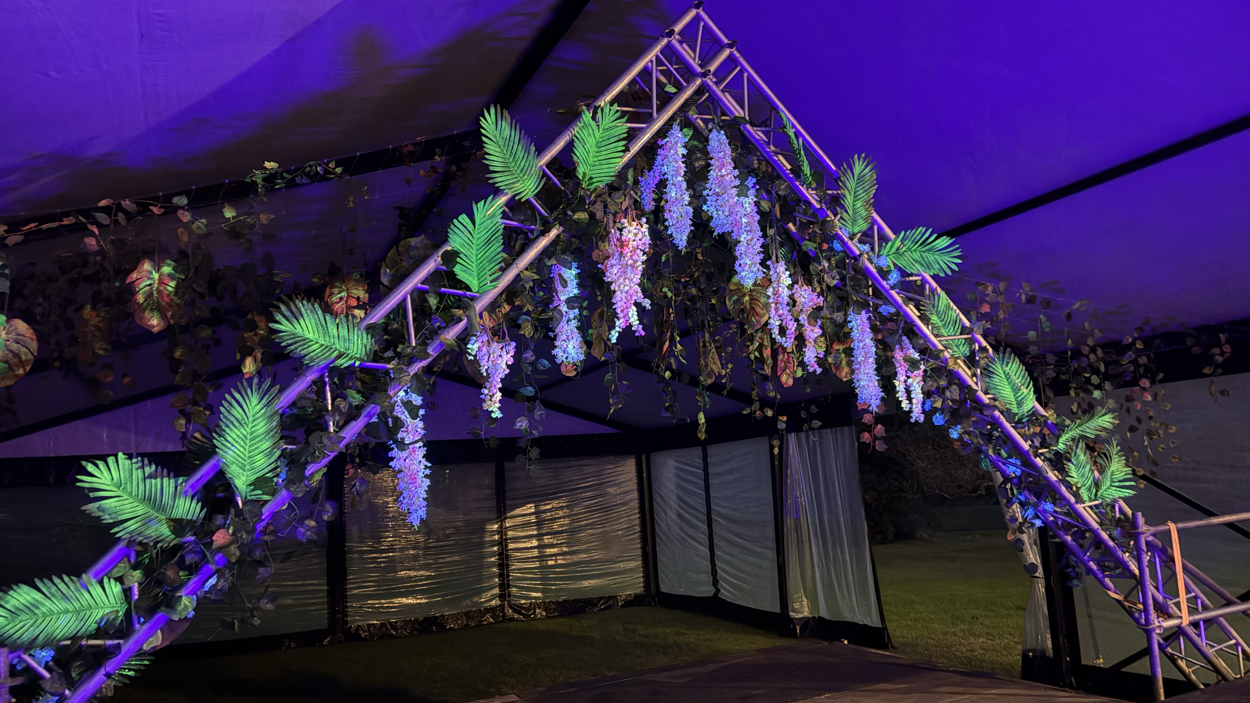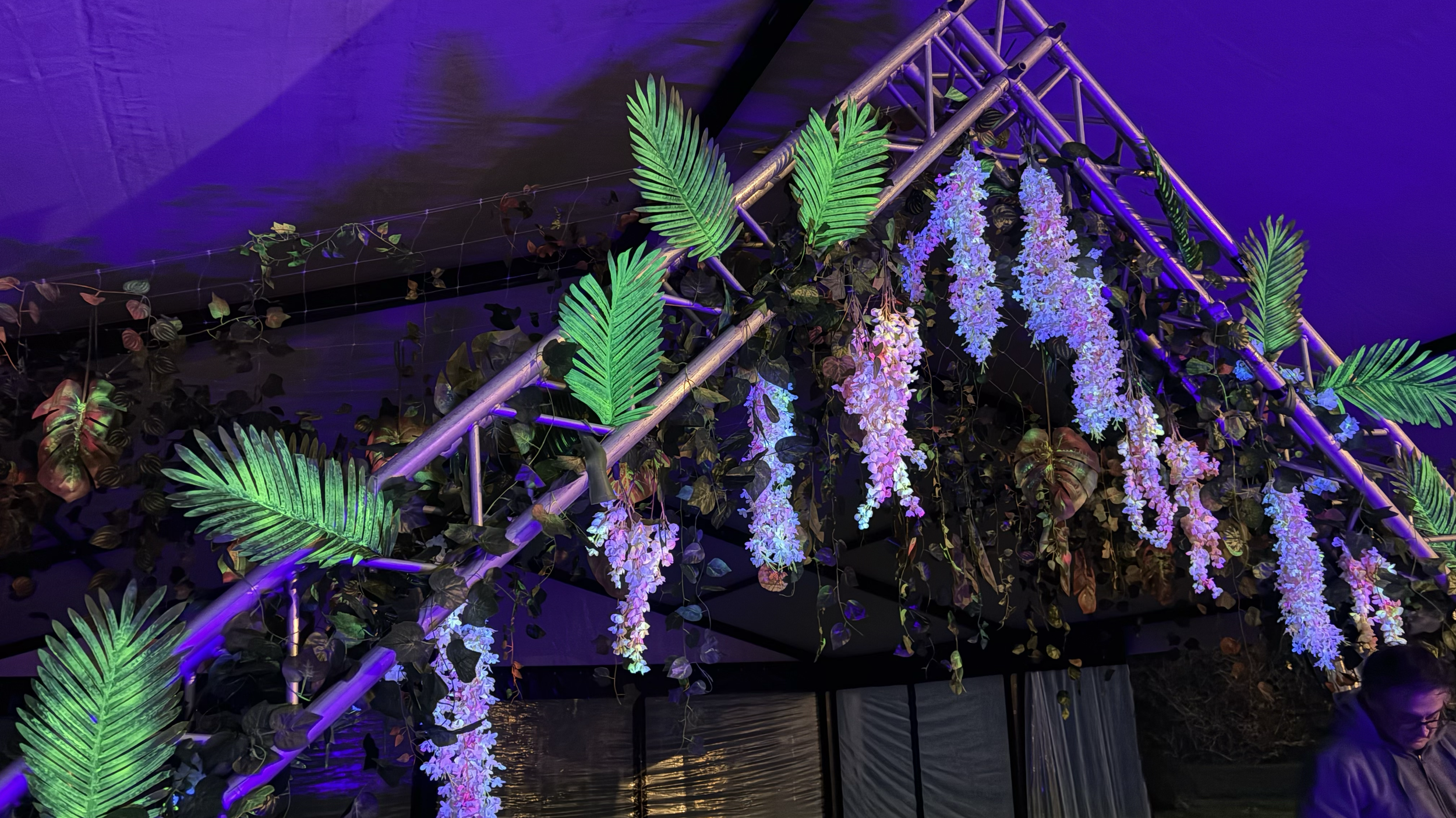 Carpa electrónica: el techo fue transformado en una instalación artística con plantas artificiales pintadas a mano con pigmentos fluorescentes. Bajo la luz negra, la cúpula se convirtió en un entorno vibrante, psicodélico y envolvente.